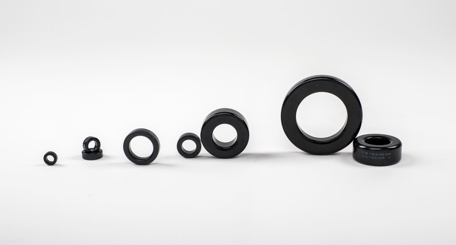 鐵硅鋁磁粉芯(KS)是由85%Fe,9%Si,6%Al的合金粉末生產(chǎn)出來的一種金屬軟磁材料,是由二十世紀(jì)三十年代日本人發(fā)明的,因其發(fā)明地點(diǎn)在日本仙臺,故又稱為Sendust合金,而美磁公司(Magnetics)稱其為Kool Mu,由于該鐵芯是一種低損耗和相對高的飽和磁感應(yīng)強(qiáng)度(10500高斯)的磁性材料,所以非常適用于功率因數(shù)校正電路(PFC電感器),脈沖回掃變壓器和儲能濾波電感器。該軟磁材料磁致伸縮接近零,也特別適用于消除在線噪音的濾波器。鐵硅鋁磁芯在制造過程中不用有機(jī)粘合劑,因此沒有熱老化的問題,可長期使用在200℃的工作范圍。目前可生產(chǎn)磁導(dǎo)率從26μ~125μ、及各種形狀的產(chǎn)品(有環(huán)形、U型、E型、塊狀型)是一種性價(jià)比較高的粉末磁芯。